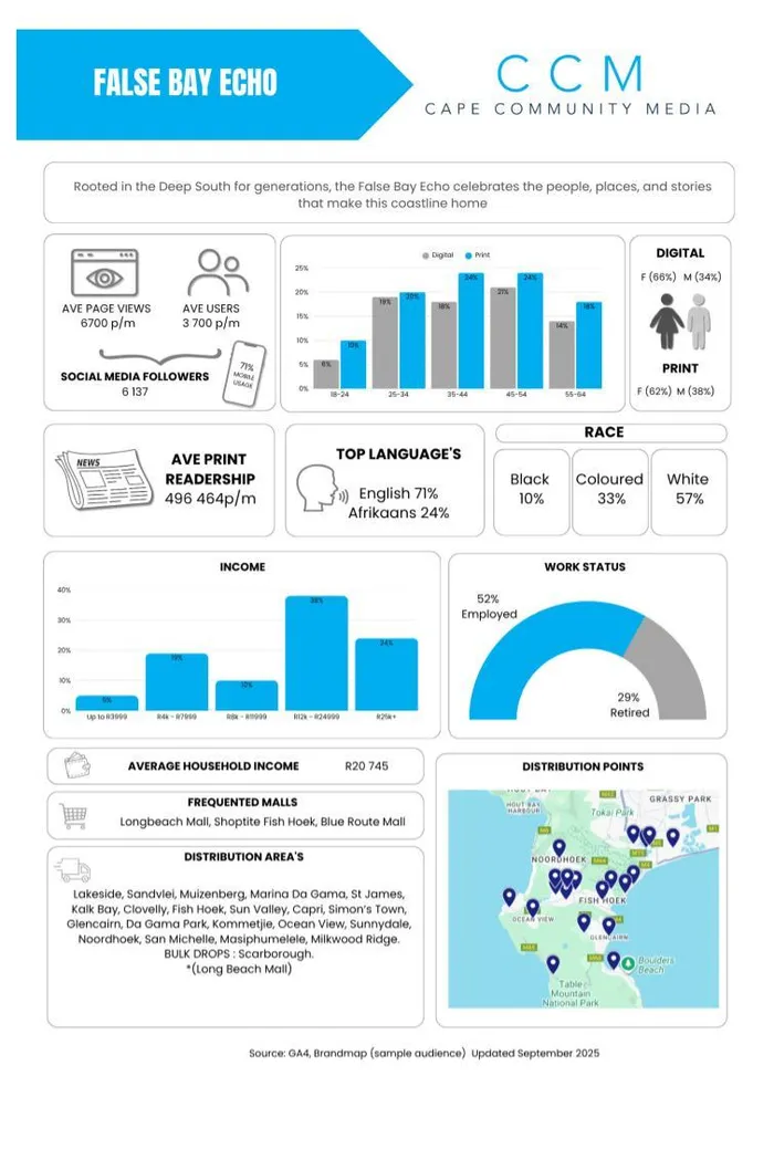 The False Bay Echo is a free weekly community newspaper available in print and digital format, and is distributed to 31 590 readers’ homes every Thursday in the Lakeside, Sandvlei, Muizenberg, Marina Da Gama, St James, Kalk Bay, Clovelly, Fish Hoek, Sun Valley, Capri, Simon’s Town, Glencairn, Da Gama Park, Kommetjie, Ocean View, Sunnydale, Noordhoek, San Michel, Masiphumelele and Milkwood Ridge areas with bulk drops in Scarborough.