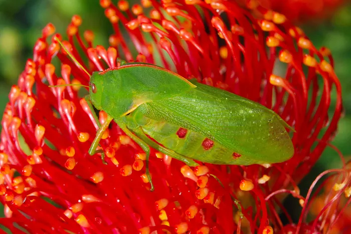 Charles Dagnall took this picture of a colourful visitor, a true leaf katydid, posing on a pin cushion protea in his garden.