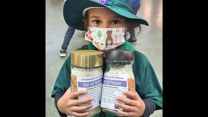 The 1st Muizenberg Meerkats spent the final meeting of the second term making Jars of Hope in preparation for their Mandela Day community service project on Monday July 18. The leader of the meerkat den, Marihett Bredenkamp, otherwise known as Rafiki, said the meerkats made more than 60 Jars of Hope that will be donated to charities. Each Jar of Hope includes soup ingredients that will provide a meal for a family of four. Pictured is Haniya Karjieker with the Jars of Hope she made.