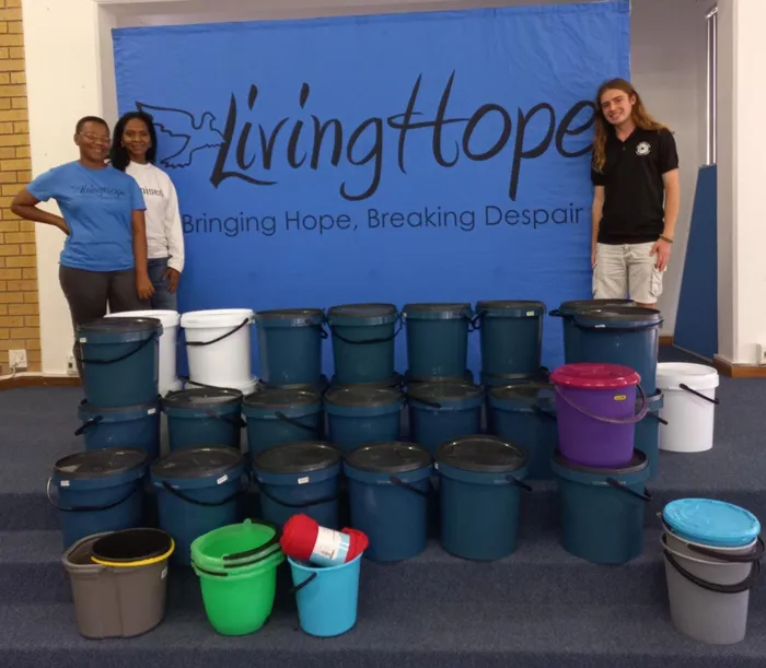 Nathaniel Madgwick handed over 31 buckets of toiletries to Living Hope for poor communities. Nathaniel is seen here with Living Hope’s Jo-Anne Meyer, left, and Siphokazi Doko.