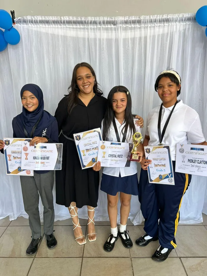 Grade 5 teacher Leigh-Ann Isaacs with the Grade 5 overall top achievers from left: Humaira van der Fort, third place, Crystal Fritz, first place and Phinley Clayton, second place.