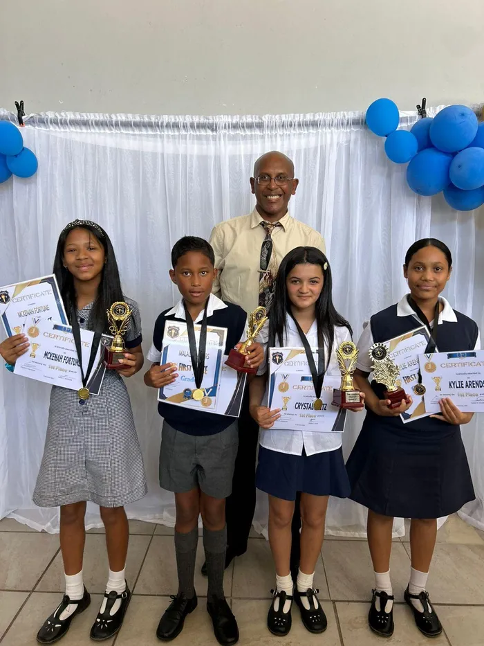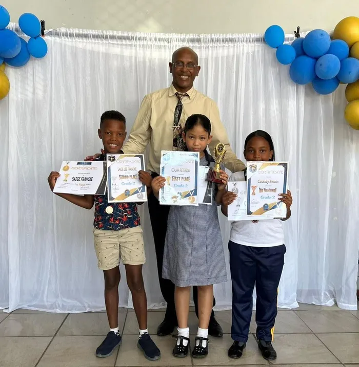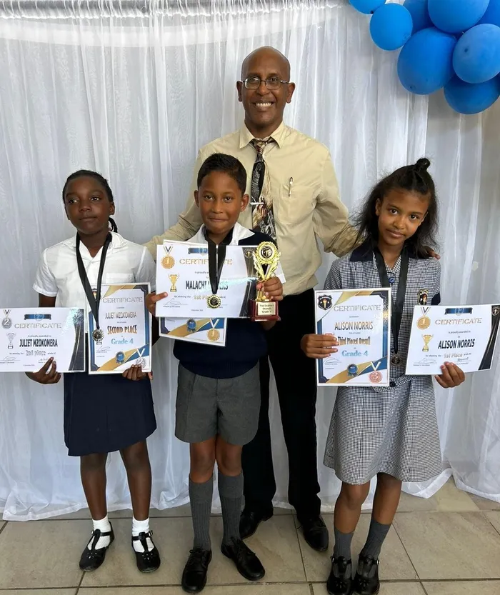 Principal Denzil van Graan with the Grade 4 overall top achievers from left: Juliet Mzokomera, second place, Malachi Layters, first place, and Alison Norris, third place.