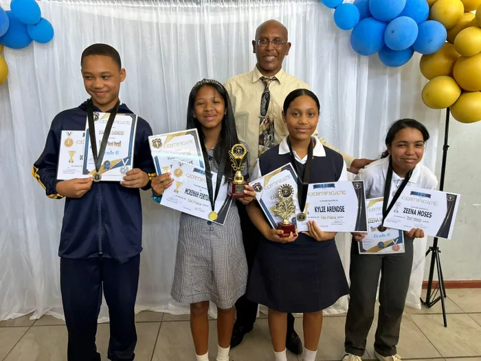 Principal Denzil van Graan with the Intermediate Phase (Grades 4–6) overall top achievers from left: Mckenah Fortune, joint first place for Grade 6, Malachi Layters, Grade 4 first place, Crystal Fritz, Grade 5 first place, and Kylie Arendse, Grade 6 joint first place.