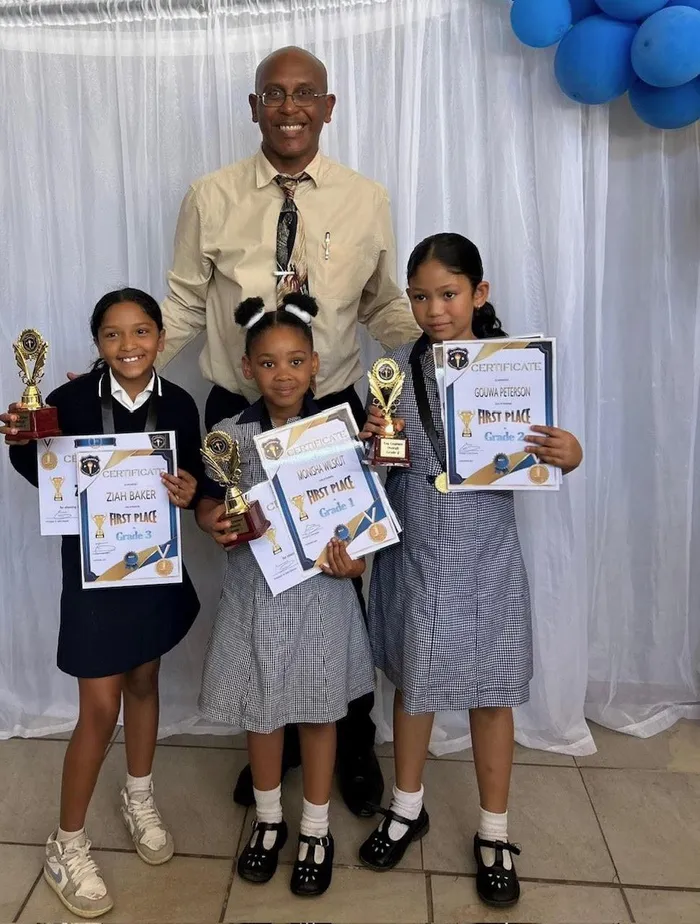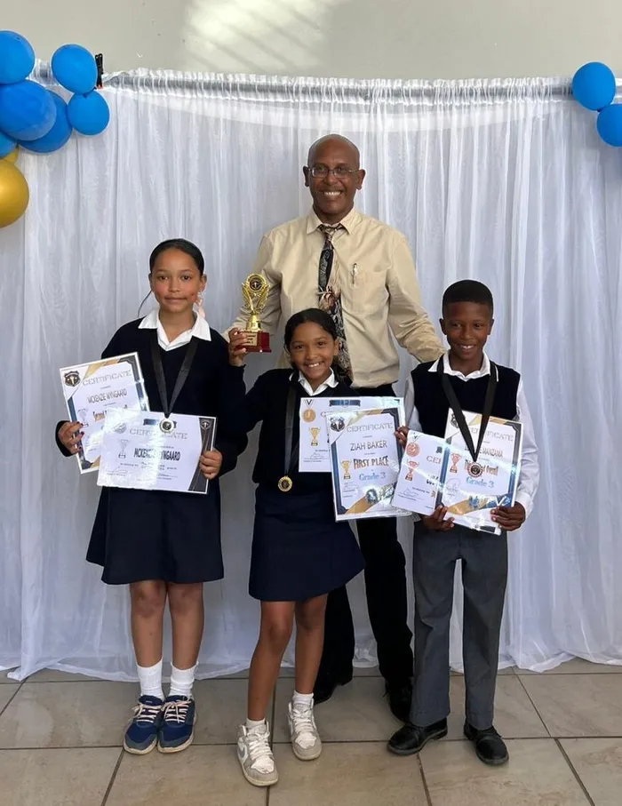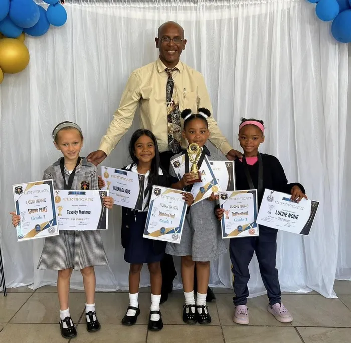 Principal Denzil van Graan with the Foundation Phase (Grades 1–3) overall top achievers from left: Ziah Baker, Grade 3 first place, Monisha Wiskut, Grade 1 first place, and Gouwah Peterson, Grade 2 first place.