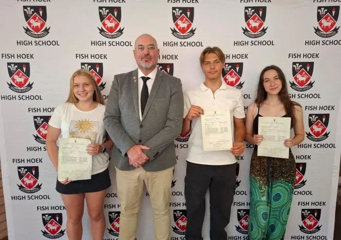 Fish Hoek High School’s top achievers for 2025 are, from left, Danielle Downes with a 90.9% aggregate and seven distinctions, Leo Mostert with 90.7% and seven distinctions, and Nina Gibson with 86.7% and six distinctions. They are pictured with principal Steven Joubert