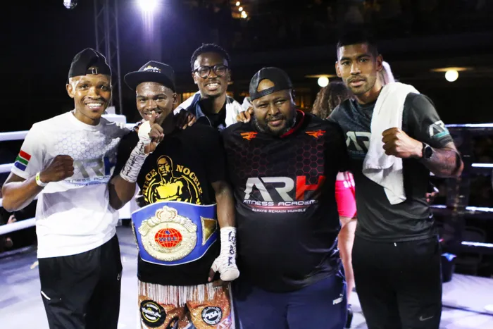 Asekho Nocele with his coaching staff after retaining his WBF inter-continental title at the weekend.