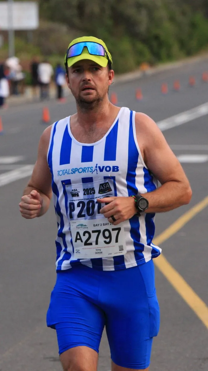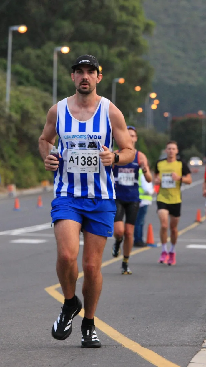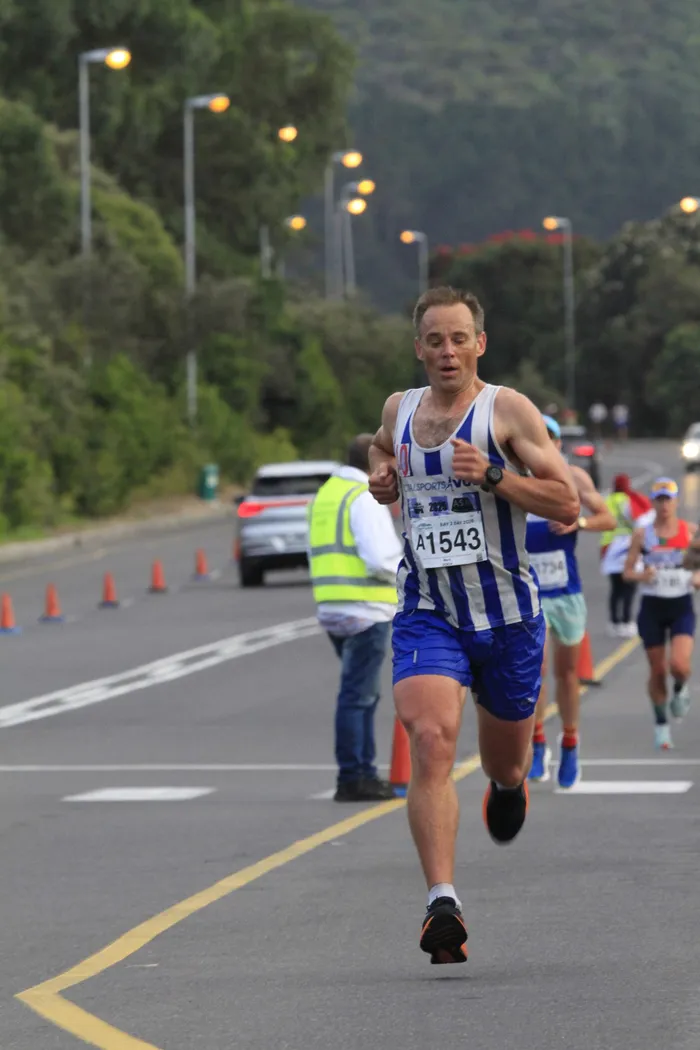 VOB's Mark Pikker maintains a steady pace on arrival in Hout Bay,during Sunday's Bay to Bay 30km run.