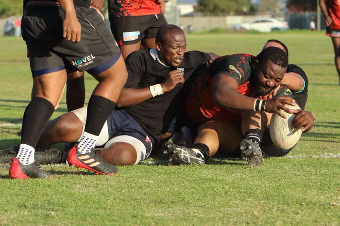 Masiphumelele RFC's Siyabonga Mbali crashes through the Blakes defence to score a well worked try during 2025 league fixture.